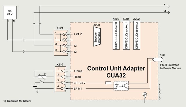 CUA32 控制单元适配器可将 PM-IF 接口转换为 DRIVE-CLiQ 接口。CUA32 控制单元适配器还配有一个集成式编码器分析装置,可针对 HTL/TTL 或 SSI 编码器进行配置。通过 CUA32 控制单元适配器,可用控制单元来控制模块型变频装置的运行,例如,作为多轴传动装置旁的一个单轴传动装置。在此情况下,从控制单元的角度看,CUA32 控制单元适配器必须是 DRIVE-CLiQ 链路中的最后一个设备。