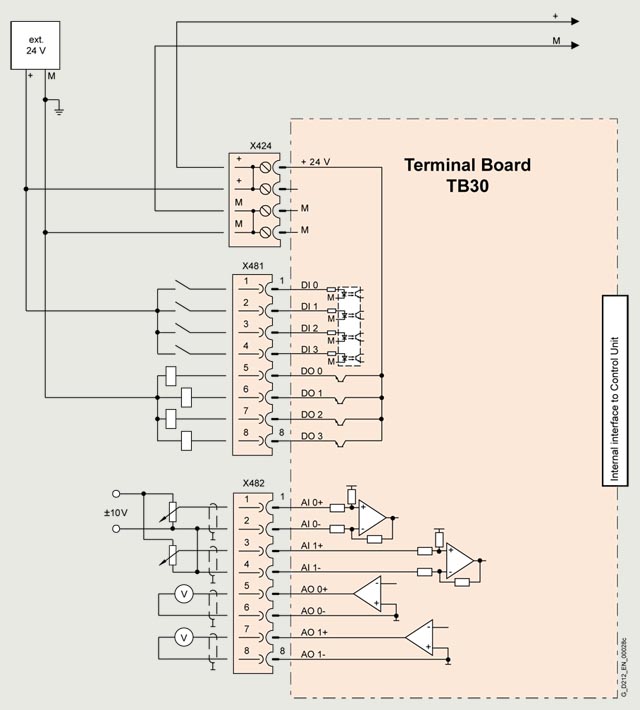 通过 TB30 端子扩展板,可以向控制单元添加数字量输入/数字量输出以及模拟量输入/模拟量输出。