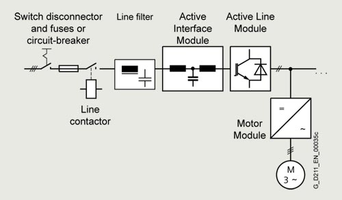 为了操作有源整流装置,必须使用具有适当额定值的有源滤波装置。为了确保符合 EN 61800 3 标准的类别 C2 所规定的限值,还可以安装一个进线滤波器 EN 61800‑3。