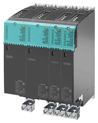 输出功率更高的装置(约 100 kW 或更高)采用变频调速装置结构。它们分为整流装置、电源模块和逆变装置。机架型模块是通过一个内部空气冷却回路进行冷却的。可以针对特殊应用(如挤出过程或船舶工程)订购水冷式设备。CU310‑2 控制单元可被集成到电源模块中。