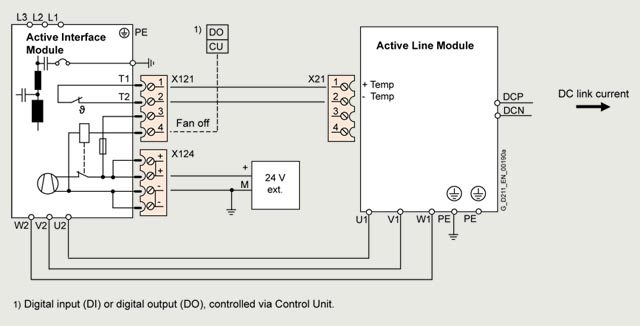 采用 24 V DC 电源后,风扇转动,并且如果需要(使用寿命,噪音),可通过控制单元的风扇关闭输入关闭风扇。只允许在驱动系统的馈电不工作的情况下关闭风扇,否则调节型接口模块将会过热。