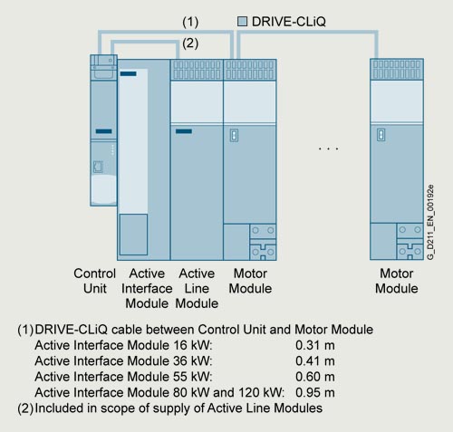 取决于驱动系统中调节型接口模块的位置,可能需要附加的 DRIVE-CLiQ 电缆。如果单独安装在靠近控制单元和调节型电源模块的左侧,则不需要附加的 DRIVE-CLiQ 电缆。如果调节型接口模块放置在控制单元和调节型电源模块之间,随调节型电源模块供应的 DRIVE-CLiQ 电缆适用于建立总线形拓扑结构,如调节型电源模块和所有的电机模块串联在同一 DRIVE-CLiQ 电缆上。如果调节型电源模块通过单独的 DRIVE-CLiQ 电缆连接,则必须订购标有(1)的 DRIVE-CLiQ 电缆。适用于接口(2)的 DRIVE-CliQ 电缆包含在调节型电源模块的供货范围之内。